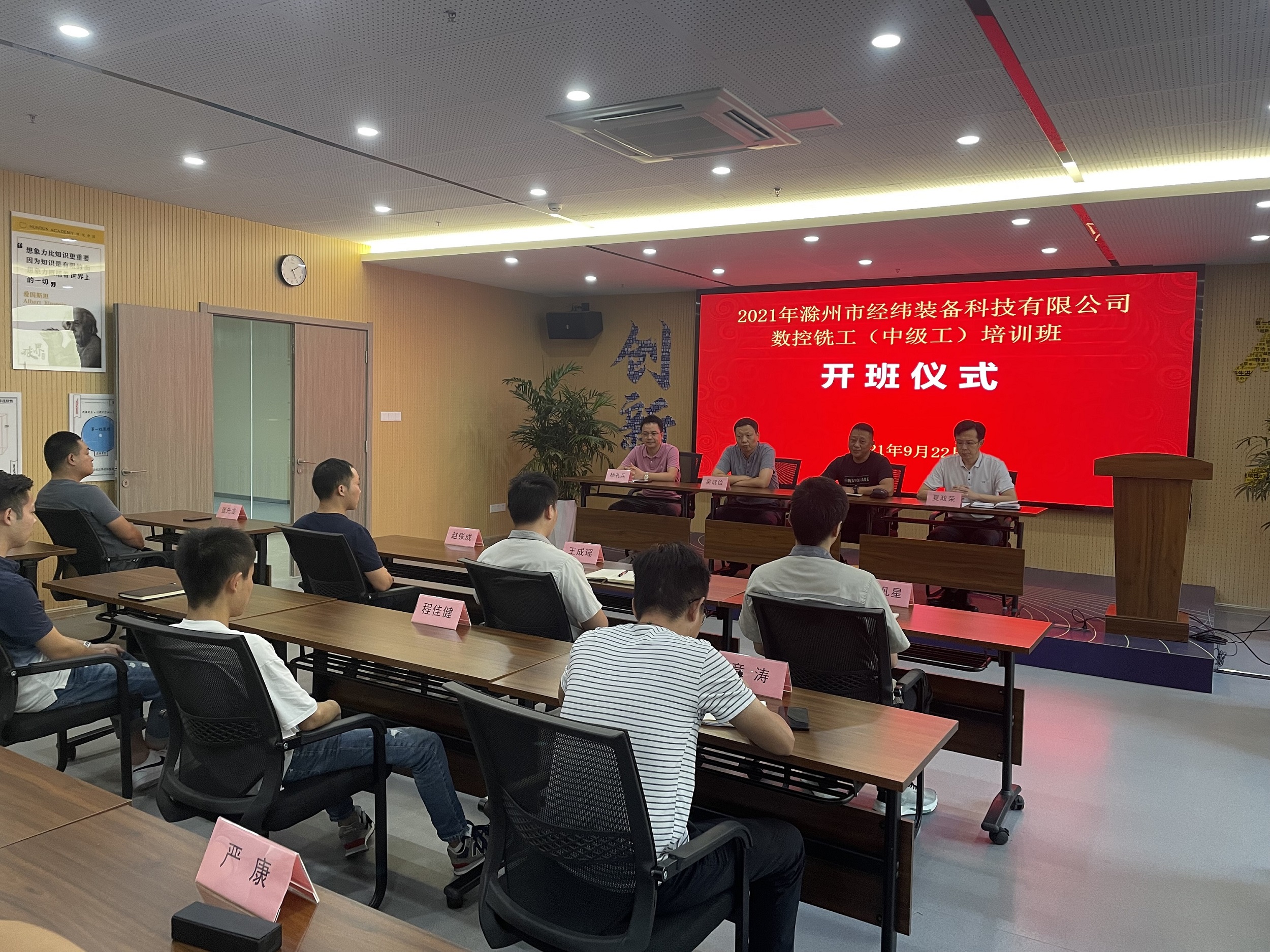 2021年9月22日,滁州市經緯裝備科技有限公司數控銑工(中級工)培訓班正式開班,開班儀式由公司職業技能等級認定工作委員會副主任夏政榮同志主持,來安縣人社局職鑒中心主任王躍進同志代表縣人社局做了指導發言,公司職業技能等級認定工作委員會主任楊禮兵同志做了相關要求發言,公司董事長吳成儉同志做了強調發言。